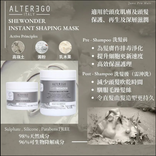 Instant Shaping Mask 適用於頭皮肌膚及頭髮 保護 , 再生及深層滋潤髮膚 適用於中等至粗頭髮 增添頭髮光澤及絲滑感 主耍成分: Kaolin Clay ( 高嶺土 ) , Starch complex ( 澱粉 ) , Shea Butter ( 乳木果 ) Pre Shampoo 洗髮前 為頭皮及頭髮作排毒淨化 提升皮膚細胞更新速度 高效保濕護理 Post Shampoo 洗髮後 有助減少頭髮吹乾時間 馴服毛躁髮絲 令直順及曲髮造型更持久 Vegan Friendly 98% 天然成分 96% 可生物降解成分 Without : Sulphate , Silicone , Parabens Made In Italy